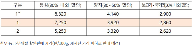 - 품목: 1+등급~2등급 등심, 양지, 불고기, 국거리 등