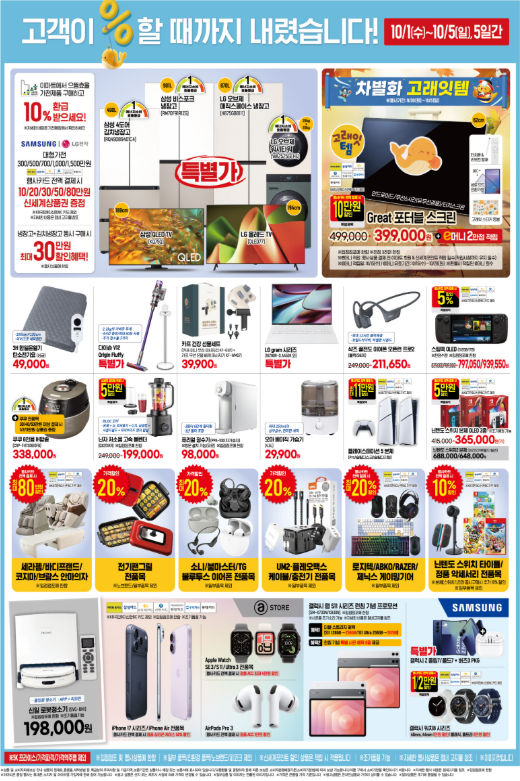 또한, 생활가전과 뷰티 상품도 초특가로 나옵니다. 신일 로봇청소기(SVC-BH1)가 198,000원에 판매되며, '글로우업' 영양장벽 시즌3 스킨케어 5종(스킨·에센스·컨센트레이트·크림·미스트)이 각각 4,950원에 나옵니다. 생활 필수품과 화장품까지 한 번에 챙길 수 있는 점이 매력적입니다.